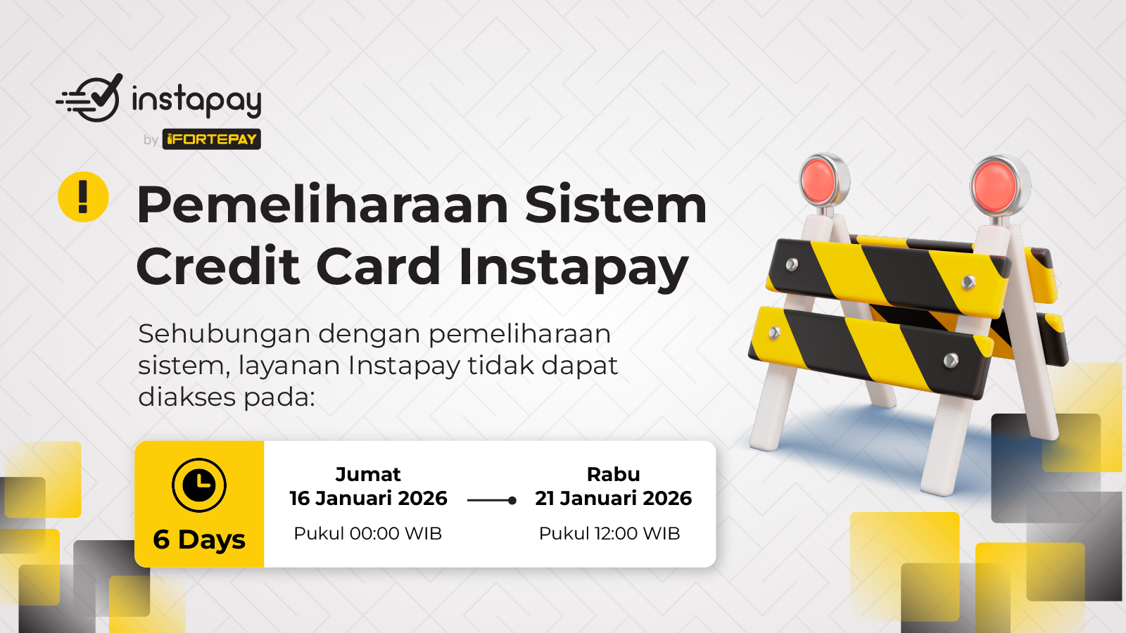 Instapay akan melakukan pemeliharaan sistem (maintenance) pada sistem pembayaran Credit Card untuk memberikan pengalaman layanan yang lebih baik.